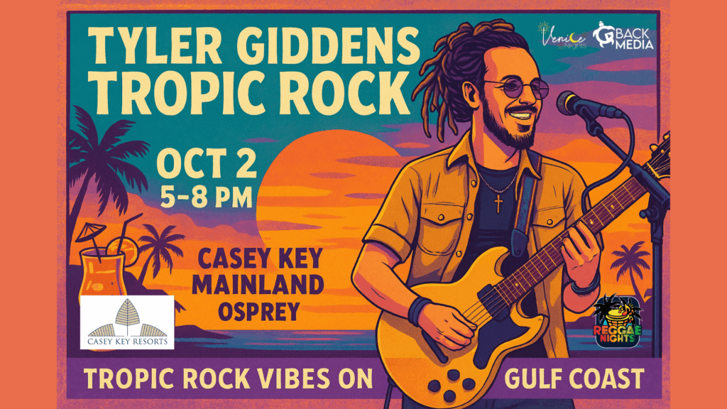 Season is almost here, and we’re kicking it off right. The official Reggae Nights Pre-Party lands at Casey Key Mainland with Tropic Rock vibes by Tyler Giddens. Cold drinks, waterfront views, and the best sunset spot in Venice make this the perfect launch for a packed fall schedule.