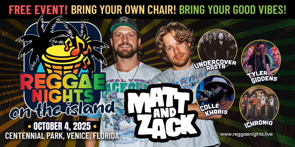 The one you’ve been waiting for. Reggae Nights on the Island shuts down Tampa Avenue with a full day of music featuring Matt & Zack, Ichroniq, Undercover Rasta, and Collé Kharis. Stay in Venice’s best resort, walk to the park, and make it a weekend to remember. Venice is quickly becoming Florida’s reggae capital — don’t miss this.